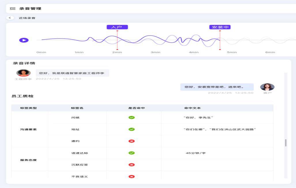 2、标准化流程的合规性保障:对于企业规定的标准流程(如必须介绍的核心条款、禁止做出的承诺),系统可基于转写文本进行快速检索与核查,确保关键动作被执行,规避合规风险。这改变了以往只能抽查的被动局面,实现了对关键流程的全面检查。